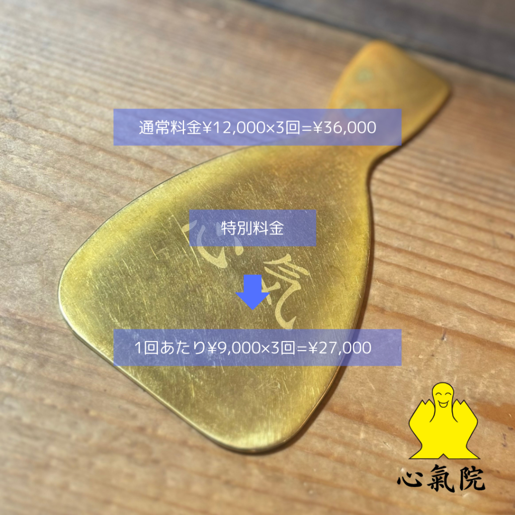 心気(オリジナルスペシャルコース約120分)を初回ご利用から20日間以内に続けて3回の施術を受けて頂けるお客様の特別料金となります。