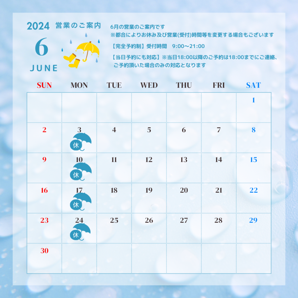 6月は定休日(月曜日)以外に特にお休み等の変更はございません。
