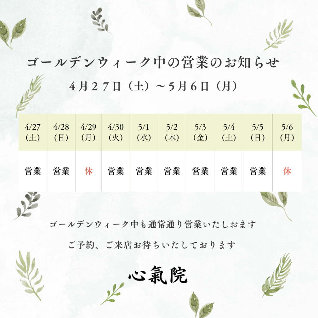 そんなゴールデンウィークも中も心氣院は特に休まず通常営業致します。